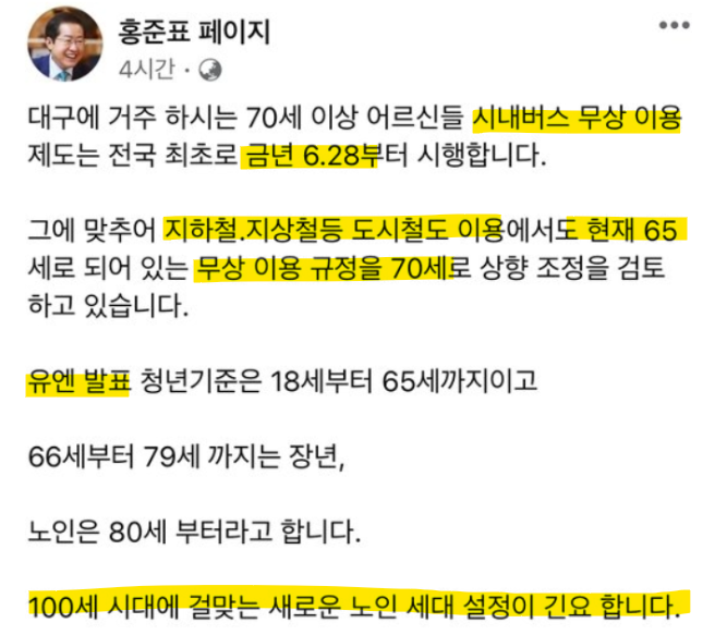 최근 홍준표 대구시장은 자신의 SNS에서 무임승차, 무상 이용 연령을 높이는 것에 대해 노인복지법 조항에 언급된 65세는 65세부터가 아닌 이상으로 되어있기에 70세로 변경하여도 무임승차에 대해 아무런 문제가 없다고 입장을 밝힌 바 있습니다.